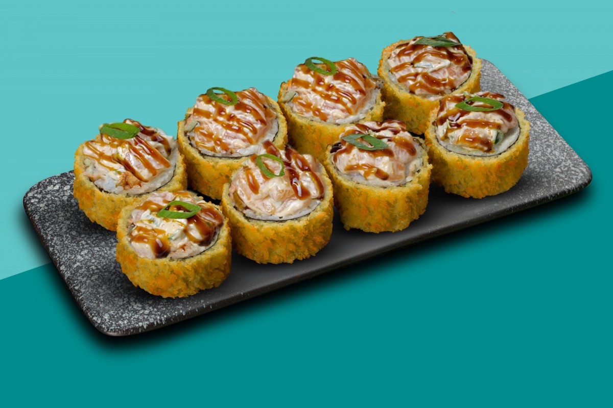 Мы решили объединить всеми любимые темпурные роллы с не менее любимыми спайси гунканами. Великолепный жареный ролл с начинкой из сливочного сыра и хрустящих огурчиков и вкуснейшей пикантной шапочкой с охлажденным лососем, спайси соусом. Украшен зеленым луком и соусом унаги.